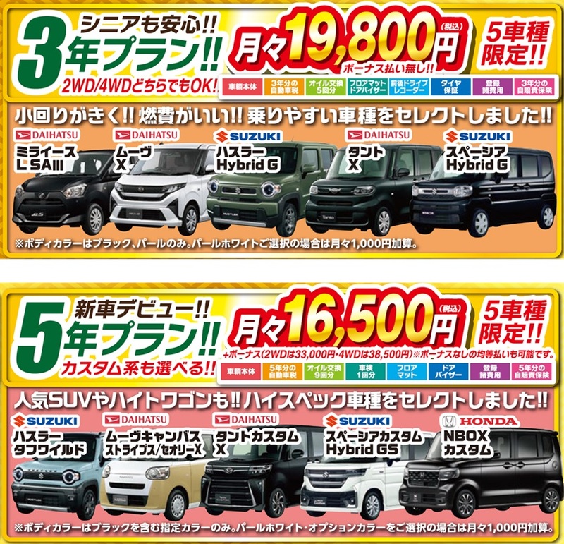 全ての車種でボーナスを均一にさせていただいていますので、33,000円(税込)のボーナスの場合には月々に5,500円(税込)を足していただければ、ボーナスなしの金額になります。